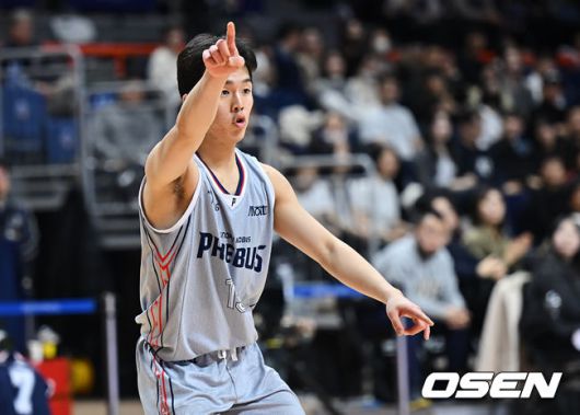 [OSEN=부산, 이석우 기자] 28일 부산 사직체육관에서 2025-2026 LG전자 프로농구 부산 KCC와 울산 현대모비스의 경기가 열렸다. 연승 행진이 멈춘 KCC가 이호현, 장재석 등 복귀 자원을 앞세워 분위기 반전에 나선다. 울산 현대모비스 김건하가 3점슛을 성공시키고 세리머니를 하고 있다. 2025.12.28 / foto0307@osen.co.kr