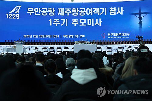 (무안=연합뉴스) 김혜인 기자 = 12·29 제주항공 여객기 참사 1주기를 하루 앞둔 28일 전남 무안국제공항 2층에서 시민들이 추모 미사를 지내고 있다. 2025.12.28