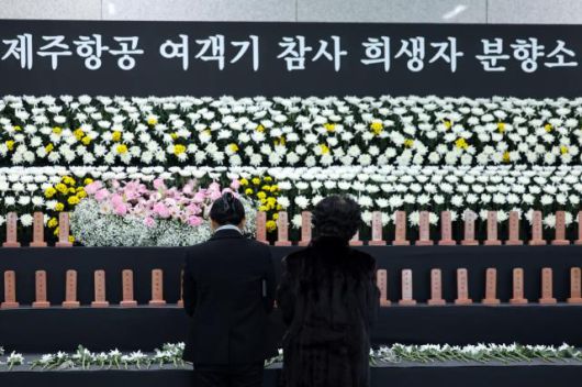 28日,“12·29”济州航空客机空难一周年纪念日的前一天,在位于全罗南道的务安国际机场集体灵堂,大批市民向事故遇难者献花追思。去年12月29日,一架济州航空波音737-800客机在务安国际机场降落时撞墙起火,造成除2人获救外,机上179人全部遇难。