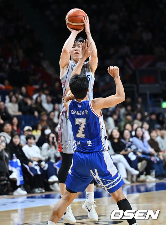 [OSEN=부산, 이석우 기자] 28일 부산 사직체육관에서 2025-2026 LG전자 프로농구 부산 KCC와 울산 현대모비스의 경기가 열렸다. 연승 행진이 멈춘 KCC가 이호현, 장재석 등 복귀 자원을 앞세워 분위기 반전에 나선다. 울산 현대모비스 서명진이 부산 KCC 허훈의 마크를 피해 슛을 시도하고 있다. 2025.12.28 / foto0307@osen.co.kr