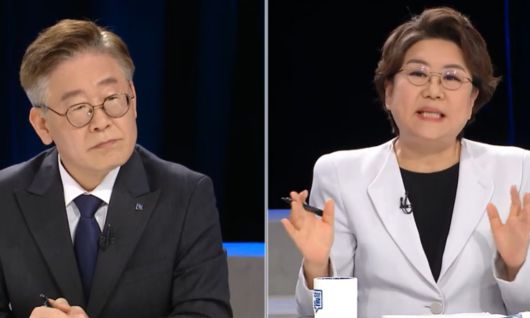 이재명 대통령이 경기도지사 시절이던 2020년 3월, ‘MBC 100분 토론’에 출연, 이혜훈 당시 미래통합당 국회의원(오른쪽)과 재난기본소득 도입을 주제로 토론을 하고 있다. 사진=MBC 100분 토론 유튜브 영상 캡처 |