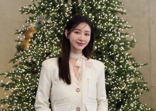 사진 속 한그루는 크리스마스 트리 앞에서 화이트 트위드 셋업 원피스를 착용하고 리본 스카프를 두른 채 청순한 비주얼을 선보이고 있다.