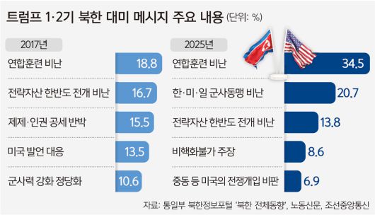 도널드 트럼프 2기 행정부가 출범한 올해 북한이 미국을 향해 내놓은 메시지의 주요한 특징이다. 트럼프 1기 정부가 출범한 2017년의 메시지와 비교하면 더욱 두드러진다. 김정은 국무위원장, 김여정 노동당 부부장의 메시지 비중이 크게 늘었고, 두 사람만이 ‘핵보유국 북한’을 전제로 한 대화 가능성을 언급했다는 점이 주목된다.