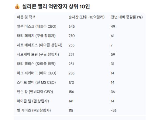 최근 AI 선두 경쟁에서 존재감을 키운 구글의 래리 페이지와 세르게이 브린 공동 창립자는 각각 2위와 4위로 올라섰다. 제미나이의 출시로 첨단 모델 경쟁에서 앞서갔다는 평가와 동시에 자체 칩 TPU가 엔비디아의 경쟁 대상으로 꼽힘에 따라, 이들의 자산은 지난해 대비 60%가량 불어났다.