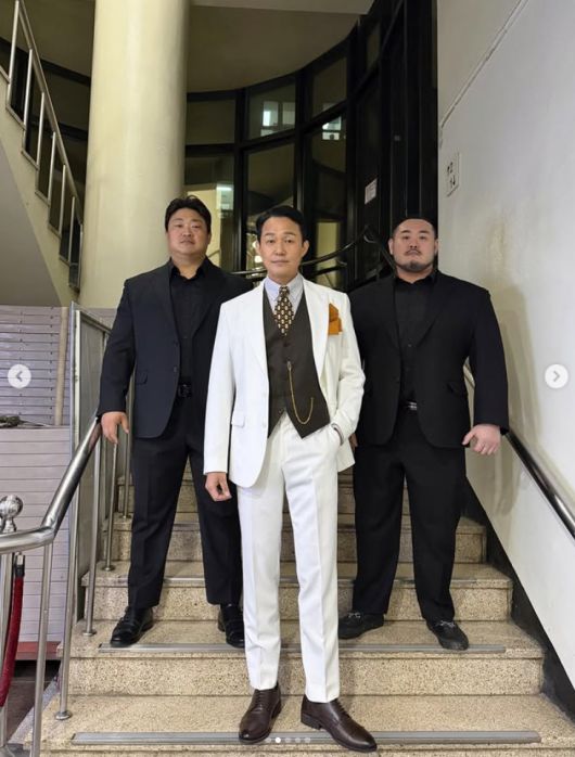 사진 속 박성웅은 하얀색 슈트를 차려입고 백댄서로 보이는 거구의 남성들과 포즈를 취했다. 영화 '신세계' 속 이중구의 캐릭터를 그대로 가져온 듯한 모습.