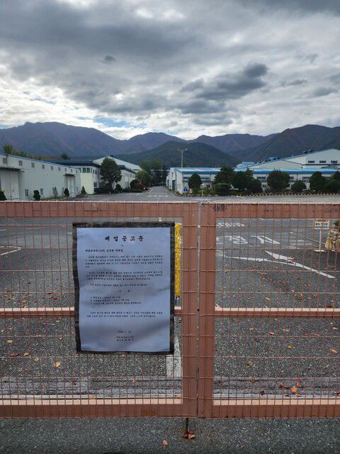 2022년 7월12일, 울산 길천산업단지 내 자일대우버스 공장 정문에 폐업 공고문이 붙어 있다. 회사는 당일 해고 문자를 받은 직원들의 출입을 막기 위해 문을 닫아걸었다. 필자 제공 |