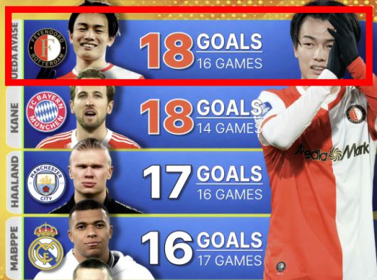 16일 당시 기준으로 우에다는 엘링 홀란(맨체스터 시티·17골), 킬리앙 음바페(레알 마드리드·16골)보다 더 많은 골을 넣은 공격수로 이름을 날렸다.