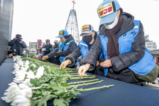 27일 제주항공 여객기 참사 희생자 유족들이 광주 동구 5·18 민주광장에서 헌화하고 있다. 연합뉴스