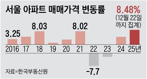 올해 서울 아파트 값이 2006년 이후 19년 만에 가장 큰 폭의 상승률을 기록했다. 이재명 정부 출범 반년 만에, ‘미친 집값’이란 말이 나왔던 문재인 정부 시절 최고 상승률(2018년 8.03%)을 넘어선 것이다. 다주택자 규제로 ‘똘똘한 한 채’ 선호 심리가 갈수록 강화되는 가운데, 새 정부 출범 후 쏟아낸 각종 부동산 규제가 서울 쏠림을 되레 심화시켜 이례적인 급등세를 부추겼다는 해석이 나온다.