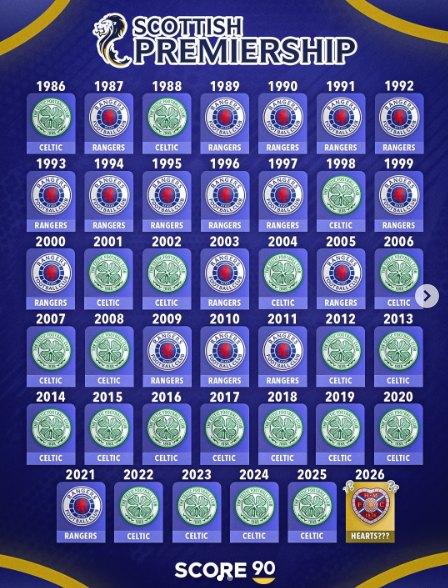 1985-1986시즌부터 2024-2025시즌까지 셀틱이 22번 우승을 차지했고, 레인저스가 18번 정상에 올랐다.