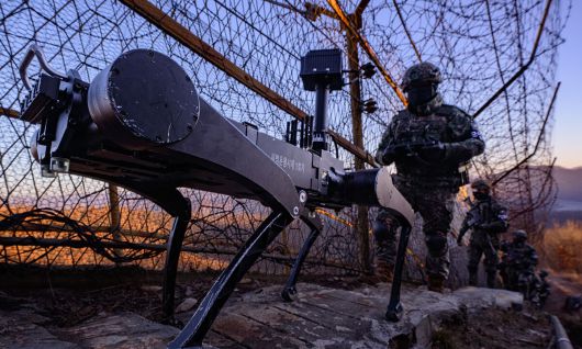 새날이 밝아오는 지난 22일 새벽, 경기도 연천군 접경지역에서 5사단 열쇠부대 장병들이 시범운용 중인 다족보행 로봇을 앞세우고 철책을 따라 경계근무를 서고 있다. 28일 육군에 따르면 직접 접근하기 어려운 지역에서 경계작전을 펼칠 수 있도록 로봇을 시범운용 중이다. 다족보행 로봇은 미래형 전투체계 ‘아미타이거(Army TIGER)’ 추진에 따라 개발, 보급됐다. 우리 군은 급격하게 변화하는 전장 상황에 능동적으로 대응할 수 있는 첨단장비 확충에 진력하고 있다.