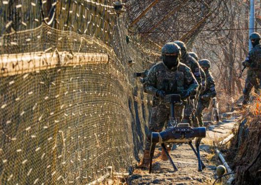 저물어가는 한 해의 끝자락, 경기 연천군 최전방 철책에도 어김없이 여명이 밝아온다. 22일 육군 5사단 장병들이 4족 보행 로봇을 앞세워 가파른 순찰로를 점검하며 경계 근무에 만전을 기하고 있다. 육군이 '아미타이거(Army TIGER)' 구축의 일환으로 시범 운용 중인 이 로봇은 장병들이 접근하기 어려운 험지나 위험 지역에서 정찰 및 감시 임무를 수행한다. 매서운 추위 속에서도 첨단 기술과 결합해 한층 견고해진 장병들의 안보 의지가 대한민국 국방의 혁신적인 미래를 예고하고 있다. 연천=하상윤 기자