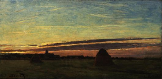이 작품은 넓은 들판 위로 해 질 녘 하늘의 다채로운 색감과 길게 펼쳐진 구름을 그렸다. 자칫 밋밋해 보일 수 있었던 그림이나, 모네는 추수를 마치고 농부들이 쌓아 놓은 건초더미를 바위처럼 커다랗고 무겁게 그려 넣었다. 30년 뒤 모네는 이 건초더미를 다시 그림의 주인공으로 삼는다. 1890년 여름 말부터 1891년 봄까지 제작된 ‘건초더미’ 연작이다.