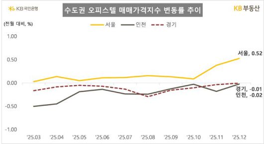 28일 KB부동산이 발표한 12월 KB오피스텔 통계에 따르면 서울 오피스텔 매매가격 상승률은 0.52%로 2022년 5월(0.79%) 이후 최고치를 기록했다.