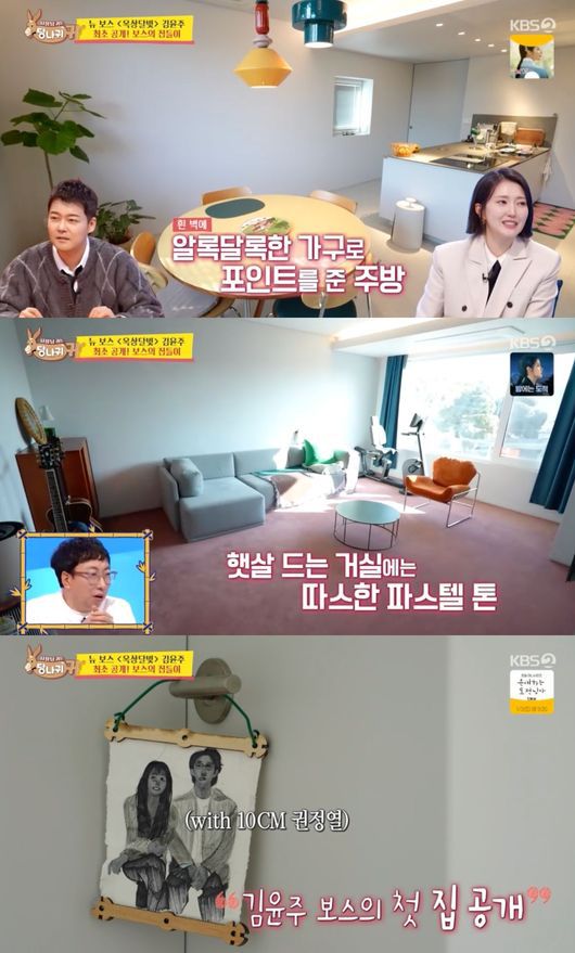 김윤주-권정열 부부의 취향이 고스란히 담긴 모던 화이트 인테리어에 절로 감탄이 터진 가운데, 흰 벽에 알록달록한 가구로 포인트를 준 주방, 거실에는 따스한 파스텔 톤. 아티스트다운 감성 공간으로 눈길을 끌었다.