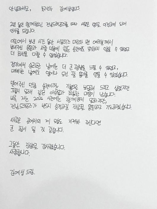 한편, 김예성은 포항으로 가기 전 개인 계정을 통해 "2년 동안 함께했던 전남을 떠나 새로운 팀으로 이적하게 되어 인사를 드린다"며 "서포터즈 미르와 팬 여러분께서 보내주신 응원과 사랑 덕분에 힘든 순간에도 포기하지 않을 수 있었고 더 최선을 다할 수 있었다"고 정성 담긴 손편지를 공개했다.