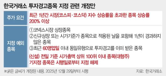 앞서 한국거래소 시장감시위원회는 이날부터 시장감시규정 시행세칙을 개정해 코스피·코스닥 시장 통합 시가총액 기준 상위 100위 이내 종목을 투자경고종목 지정 대상에서 제외한다고 밝혔다. 그동안 SK하이닉스는 최근 1년간 주가가 200% 이상 급등했다는 이유로 투자경고종목으로 지정됐다. 그러나 올해 들어 SK하이닉스를 비롯해 주요 대형·주도주들이 잇따라 투자경고 대상에 포함되면서 “시장 주도 대형주까지 기계적으로 규제하는 것은 과도하다”는 지적이 시장에서 잇따라 제기돼 왔다.