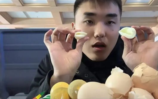 중국 SNS에서 ‘9분 12초 삶기’ 달걀 레시피로 화제를 모은 펑창쉬가 반숙 상태를 직접 보여주고 있다. 더우인 영상 캡처 |
