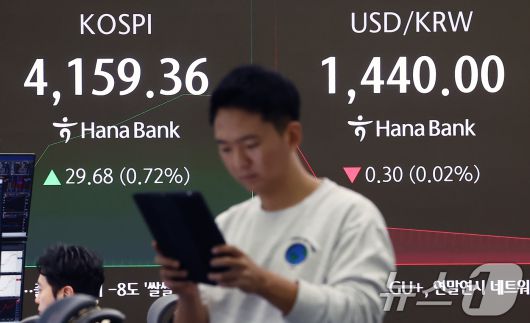 (서울=뉴스1) 김민지 기자 = 29일 오전 서울 중구 하나은행 딜링룸 전광판에 코스피 지수가 나오고 있다. 이날 코스피는 전 거래일 보다 16.80포인트(0.41%) 오른 4146.48, 코스닥 지수는 3.55포인트(0.39%) 오른 923.22에 거래를 시작했다. 원·달러 환율은 전 거래일 주간거래 종가(1445원)보다 4원 내린 1441원에 출발했다. 2025.12.29/뉴스1
