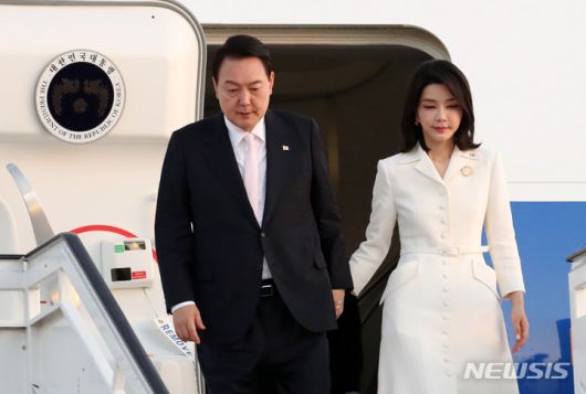 [마드리드=뉴시스] 윤석열 대통령과 부인 김건희 여사가 27일(현지시간) 마드리드 바라하스 국제공항에 도착해 트랩을 내려오고 있다. *기사 본문과는 무관한 사진. 2022.06.28. |