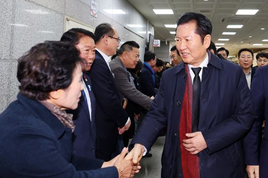 더불어민주당 정청래 대표가 29일 오전 전남 무안군 무안읍 승달문화예술회관에서 열리는 더불어민주당의 현장최고위원회의 참석에 앞서 지지자들과 인사를 하고 있다. 2025.12.29 [사진=연합뉴스] |