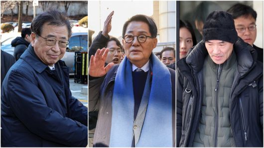 26일 서울 서초구 중앙지법애서 '서해 피격 사건 은폐 시도 및 월북몰이 혐의' 재판이 무죄로 선고가 난 후 서훈 전 국가안보실장(맨왼쪽부터), 박지원 전 국정원장, 이래진 피살 공무원 친형이 법정을 나오고 있다./ 뉴시스 |