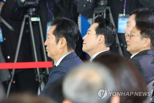 (무안=연합뉴스) 배재만 기자 = 더불어민주당 정청래 대표와 국민의힘 장동혁 대표가 29일 전라남도 무안군 무안국제공항 여객터미널에서 열린 12ㆍ29 여객기 참사 1주기 추모식에 참석해 있다. 2025.12.29