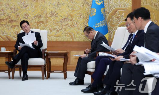 (서울=뉴스1) 이재명 기자 = 이재명 대통령이 29일 대통령실 이전 작업이 마무리된 청와대로 출근한 뒤 위성락 안보실장, 김용범 정책실장을 비롯한 참모들과 차담을 하고 있다. (청와대통신사진기자단) 2025.12.29/뉴스1