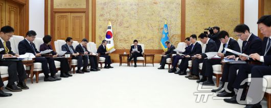 (서울=뉴스1) 이재명 기자 = 이재명 대통령이 29일 대통령실 이전 작업이 마무리된 청와대로 출근한 뒤 위성락 안보실장, 김용범 정책실장을 비롯한 참모들과 차담을 하고 있다. (청와대통신사진기자단) 2025.12.29/뉴스1