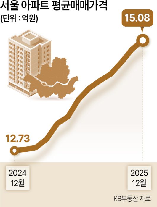 29일 KB부동산 12월 월간시계열 자료에 따르면, 이달(15일 기준) 서울의 평균 아파트 매매가격은 15억810만원을 기록해 사상 첫 15억원을 넘겼다. 7월 14억원을 넘긴 지 약 5개월만이다. 지난해 12월(12억7274만원)과 비교하면 1년 새 18.5%(2억3535만원) 올랐다.