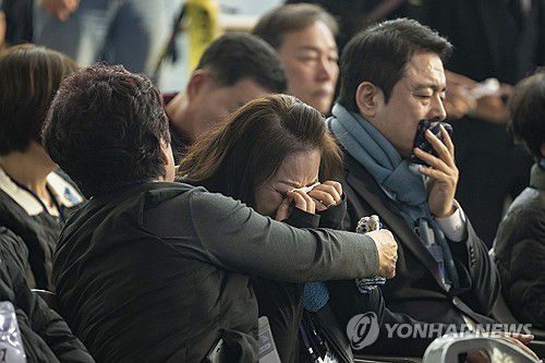 (서울=연합뉴스) 29일 전라남도 무안군 무안국제공항 여객터미널에서 열린 12ㆍ29 여객기 참사 1주기 추모식에서 유가족들이 눈물을 흘리고 있다. 2025.12.29 [공동취재]