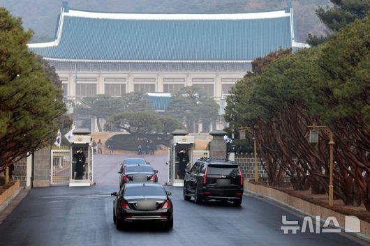 [서울=뉴시스] 최동준 기자 = 이재명 대통령이 청와대에서 집무를 시작하는 29일 이 대통령이 탄 차량이 청와대 본관으로 향하고 있다.대통령의 청와대 복귀는 2022년 5월 이후 3년 7개월 만이다. (청와대통신사진기자단) 2025.12.29. photocdj@newsis.com |