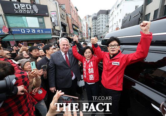 이혜훈 국민의힘 서울 중구·성동구을 국회의원 후보가 총선 시기였던 지난 2024년 3월 25일 오전 서울 중구 퇴계로 신당동 떡볶이타운에서 인요한 당시 국민의미래 선거대책위원장, 한동훈 국민의힘 대표와 함께 시민들에게 인사를 하고 있다. /남용희 기자 |