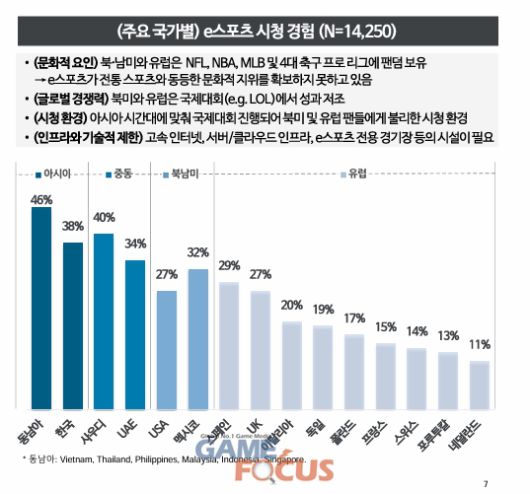 아울러 이번 자료에서 의외였던 것은 아시아 지역에서 이전부터 e스포츠가 강세였던 한국보다 동남아의 e스포츠 시청 경험의 응답 비율이 높게 나타난 것이다.