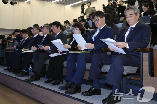(서울=뉴스1) 박정호 기자 = 김건희와 명태균·건진법사 관련 국정농단 및 불법 선거 개입 사건 등 진상규명을 위한 특별검사팀 민중기 특별검사(오른쪽부터)와 김형근, 오정희, 박상진, 문홍주, 김경호, 박노수 특검보가 29일 오전 서울 종로구 KT광화문빌딩 웨스트에 마련된 특별검사팀 브리핑룸에서 특검 수사 결과 종합 브리핑을 준비하고 있다. 2025.12.29/뉴스1