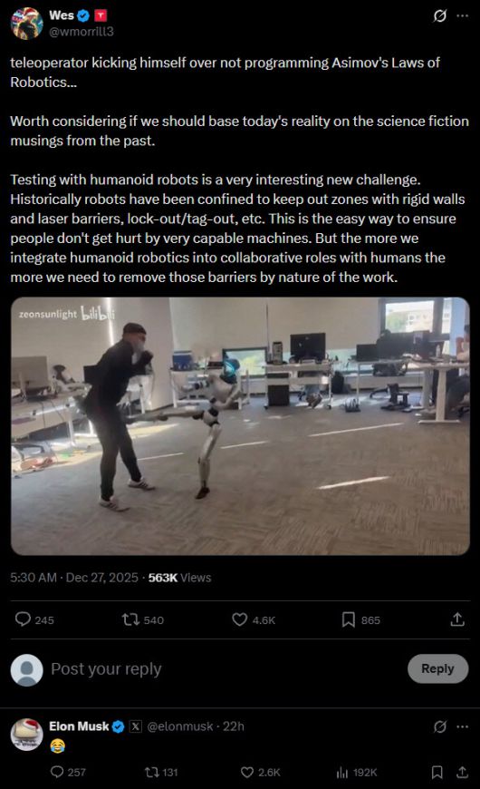 해당 영상은 테슬라 사이버트럭의 웨스 모릴 수석 엔지니어가 올린 것인데 중국 기업 유니트리 G1과 무술 동작을 시연하다가 로봇으로부터 발차기를 당하는 내용이 담겼다. 이에 머스크가 답글을 통해 유쾌한 반응을 남긴 것이다.