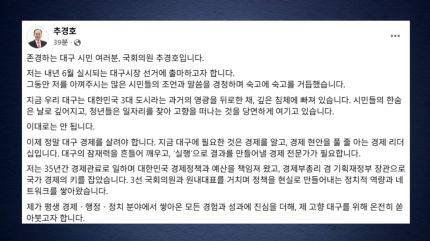 추 의원은 오늘(29일) 출마 선언문을 통해, 평생 경제·행정·정치 분야에서 쌓은 모든 경험과 성과를 이제는 고향 대구에 온전히 쏟아붓고자 한다며 이같이 밝혔습니다.