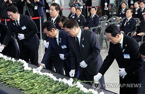 (무안=연합뉴스) 조남수 기자 = 29일 오전 전남 무안국제공항에서 열린 12ㆍ29 제주항공 에서 우원식 국회의장(오른쪽 두 번째)과 더불어민주당 정청래 대표, 국민의힘 장동혁 대표 등 국회 대표가 헌화하고 있다. 2025.12.29