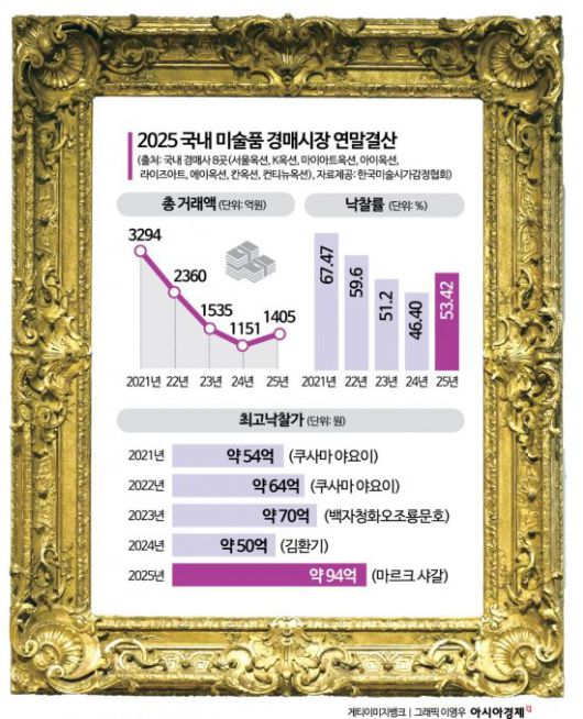 김영석 한국미술시가감정협회 이사장은 "2025년 미술품 경매시장 규모 확대를 이끈 것은 마르크 샤갈"이라며 "샤갈 작품이 약 167억7790만원어치 낙찰되며 낙찰총액 1위를 차지했다. 해외 작가가 1위에 오른 것은 3년만"이라고 말했다. 이어 "전체 낙찰총액은 증가했지만 특정 블루칩 작가에 대한 쏠림 현상은 여전하다"며 "낙찰총액 상위 30위 작가 중 국내 생존 작가는 10명에 불과하고, 40대 작가는 2명뿐이라 작가층 저변 확대가 시급하다"고 지적했다.