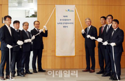 [이데일리 김태형 기자] 강호동(오른쪽 네번째) 농협중앙회장이 29일 서울 중구 농협 본관에서 제4회 동시조합장선거사무국 현판식을 하고 있다.