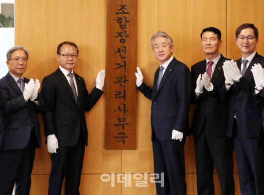 [이데일리 김태형 기자] 강호동(가운데) 농협중앙회장이 29일 서울 중구 농협 본관에서 제4회 동시조합장선거사무국 현판식을 하고 있다.