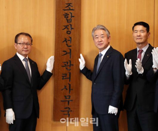 [이데일리 김태형 기자] 강호동(가운데) 농협중앙회장이 29일 서울 중구 농협 본관에서 제4회 동시조합장선거사무국 현판식을 하고 있다.