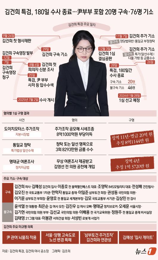 (서울=뉴스1) 김초희 디자이너 = 29일 오전 김건희 여사의 각종 의혹을 수사해 온 김건희 특검팀(특별검사 민중기)이 180일간의 수사를 마치며 "김건희는 대통령 배우자의 신분을 이용해 고가의 금품을 쉽게 수수하고 각종 인사와 공천에도 폭넓게 개입했다"고 밝혔다. 특검팀은 180일의 수사 기간 윤석열 전 대통령 부부를 포함해 총 76명을 재판에 넘겼다. 도이치모터스, 삼부토건 등 자본시장법 위반 사건, 명품 가방, 다이아몬드 목걸이 등 금품 수수 사건을 맡은 김형근 특검보는 "윤석열은 배우자의 반복적인 금품수수 사실이 있었음에도 특검 조사에서 그 사실을 전혀 알지 못했다고 부인하고 있으나 이를 쉽게 믿기는 어렵다고 할 것"이라고 말했다.