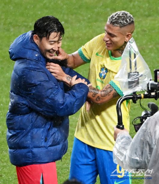 10일 서울월드컵경기장에서 열린 대한민국 축구대표팀과 브라질의 A매치 평가전, 손흥민이 히샬리송과 인사를 나누고 있다. 상암=허상욱 기자wook@sportschosun.com/2025.10.10/ |