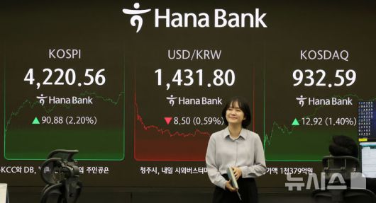 [서울=뉴시스] 홍효식 기자 = 코스피가 전 거래일(4129.68)보다 90.88포인트(2.20%) 오른 4220.56에 마감한 29일 오후 서울 중구 하나은행 딜링룸 전광판에 지수가 표시되고 있다.