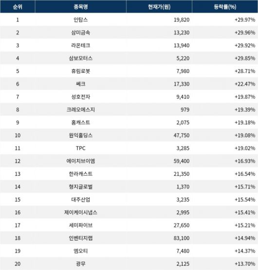 이어 상승률 2위 삼미금속(012210)은 주가가 29.96% 폭등하며 종가 13,230원에 상승 마감했다. 상승률 3위 라온테크(232680)의 주가는 13,940원으로 29.92% 폭등하며 두각을 나타냈다. 상승률 4위 삼보모터스(053700)는 29.85% 폭등하며 5,220원에 마감했다. 상승률 5위 휴림로봇(090710)은 28.71%의 상승세를 타고 7,980원에 마감했다.