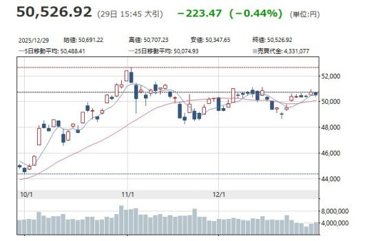 이날 닛케이225평균주가지수는 전일 종가보다 0.44%(223.47엔) 하락한 5만526.92엔에 거래를 마쳤다. 도쿄증권거래소주가지수(TOPIX, 토픽스)도 0.10%(3.46포인트) 오른 3426.52포인트로 마감하며 3일 연속 상승했다.