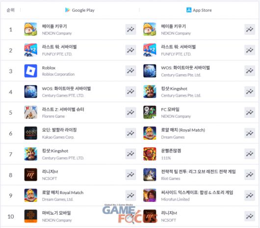 구글 플레이에서는 TOP 10 내 순위 변화가 크지 않다. '메이플 키우기'가 독주하는 가운데 '라스트 워: 서바이벌', '로블록스', '화이트아웃 서바이벌', '라스트 Z: 서바이벌 슈터' 등이 TOP 5를 기록하고 있다. '오딘: 발할라 라이징', '킹샷', '리니지M', '로얄 매치', '마비노기 모바일'이 그 뒤를 이으면서 TOP 10을 형성 중이다.