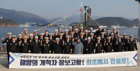 29일 오후 경남 창원시 해군잠수함사령부에서 열린 장보고함 퇴역식에서 참석자들이 기념촬영하고 있다. 송봉근 기자 |