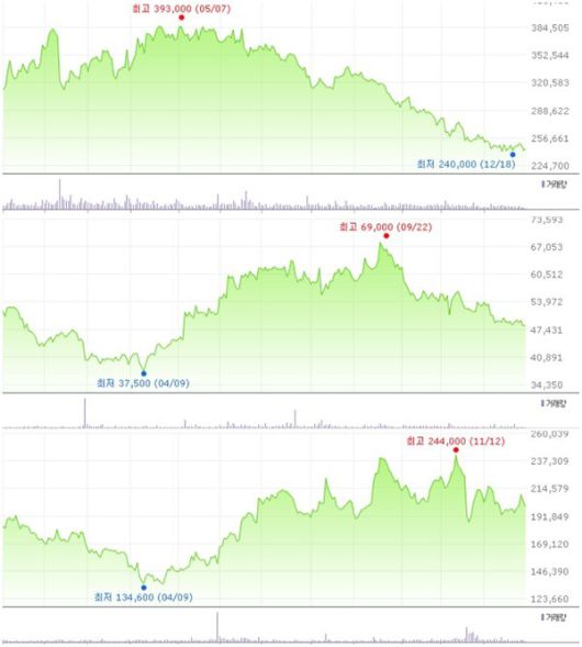 게임 대장주로 불리운 크래프톤은 부진한 모습을 보였다. 1월 2일 31만 6500원에서 12월 26일 24만 2500원의 변동을 보였다. 한 해 동안 무려 23.3% 가격이 떨어진 것이다. 52주 최고가는 39만 3000원(5월 7일), 최저가는 24만원(12월 18일)이었다. 최고가 대비 최저가는 38.9%나 떨어졌다. 반토막까지는 아니지만, 게임주 전체를 대표하는 대장주로서 아쉬운 모습이라는 평가는 바뀌지 않는다.